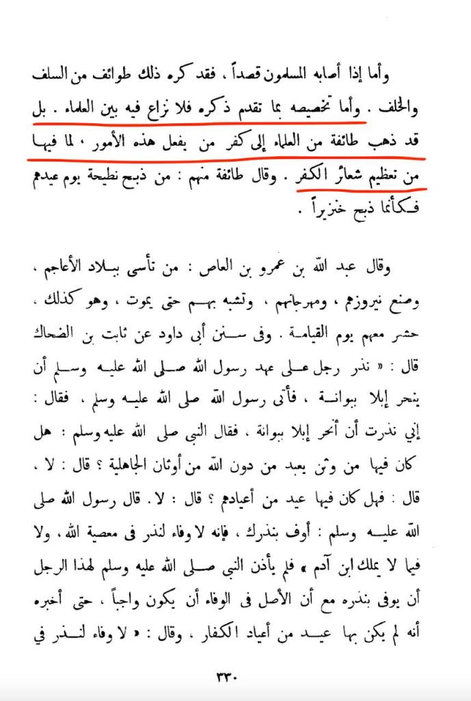 ”Det finns ingen oenighet bland de lärda gällande utförandet av dessa ovannämnda handlingar och en grupp bland de lärda ansåg till och med att den som utför dessa handlingar har begått KUFR (otro) eftersom dessa handlingar innebär glorifiering av kufr ritualer”. [Majmū’ al-Fatāwa, 25/330]